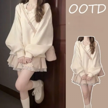 【C34419】韓風溫柔係穿搭內搭背心+甜美寬鬆衛衣+設計感短裙三件套